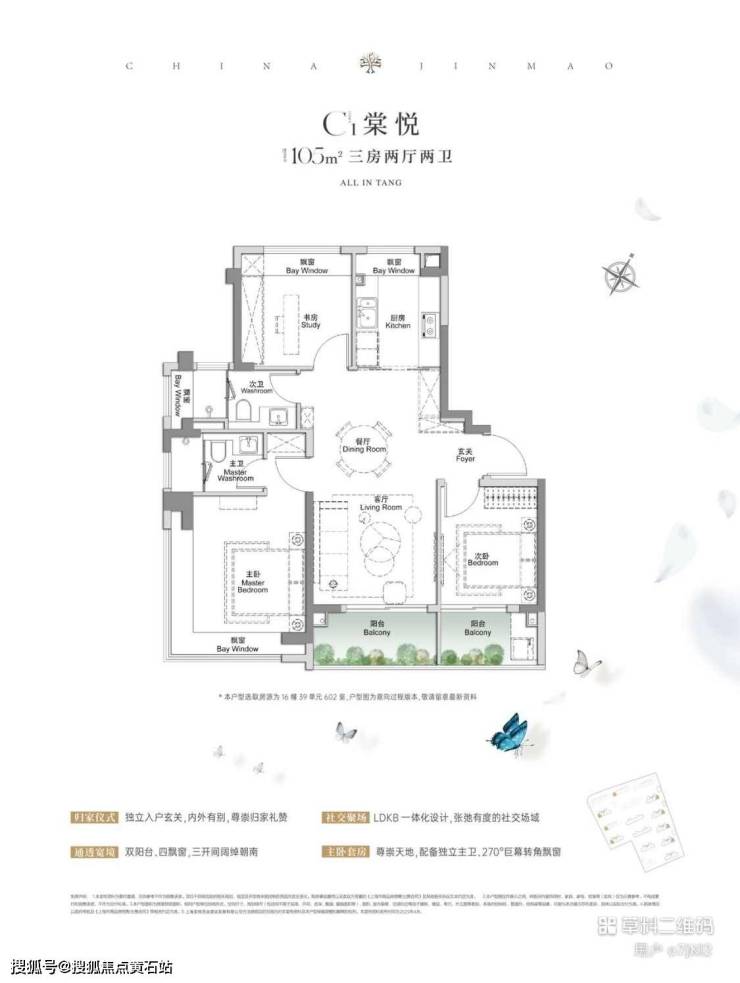 建面约105㎡,参考总价430-570万,三室两厅两卫