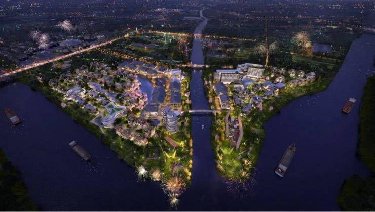 传承五千年美丽中国历史文脉,以中国古典风貌的清明上河图和四景山水图,汇聚宋、 明清、 现代多种风格建筑核心元素,结合国际化的时尚现代风格融合,依据多个水上岛屿和片状水网打造 独特的舟行交通系统,演绎现代版的马尔代夫,配套购物街、酒吧街、 美食街、水上剧场、游船码 头、水上娱乐、主题夜游、广场、艺术、露营、水影秀 等主题元素,并通过核心度假区商业中心串联,打造浮岛民宿、水巷民宿、坡地民宿、湾畔民宿、半山民宿等不同主题度假产品,创新满足人 们对中国古韵居住场所和现代度假生活的优质体验和生活遐想。