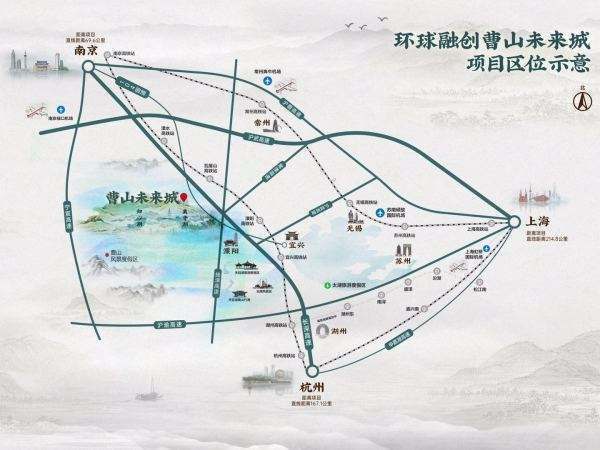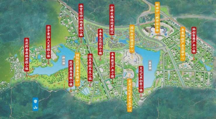 环球融创曹山未来城首期规划约14000亩,总投资500亿,规划“一山两湖四轴五心七廊十镇、十八条主题旅游线路 三十六大主题业态”,采用“一山两 湖带四轴五心多节点、多廊融合、多片区多组团渗透”的城市规划结构体系,将“产城运营 +旅游 度假 +生态休闲 +文化科技+康养生活”理念融合一体化,建设中国标杆示范休闲康养度假城市, 打造高品质、少有性、全业态、全龄化、全生命周期、全时、全域、全季、全景、全享的康养文旅 度假休闲目的地未来新城。