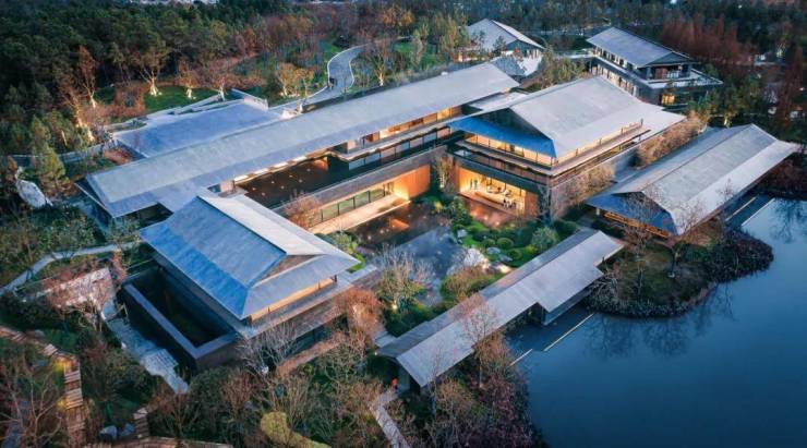 坡地民宿:保留坡地高度差,结合山地的独有风貌,建筑围合出的多样庭院空间点缀在山林中,层林叠叶之间,每一座房子互为独立,但又同气相连。清晨,优雅的院落与山雾晨曦缠绵,静谧时光里,远看光影动静浮动,便是最美的人间烟火。