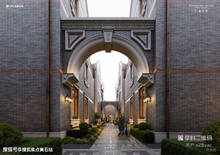 百年印记:拱形门坊及雕花汲取湖州会馆建筑灵感、装饰老建筑元素印记超级符号:菱形超级符号统一运用,室内、景观铺装、单体立面一体化延续