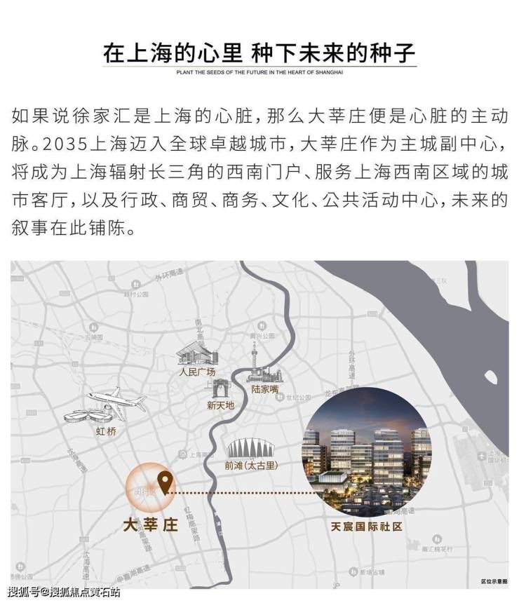 天宸国际社区坐落于上海西南主城,毗邻虹桥与莘庄两大城市副中心,位于上海西南经济最为发达、人口最为密集的莘庄、梅陇板块,经过莘庄区域20多年的持续发展,半径3公里内居住人口达30万。周边商业配套设施成熟,体育、教育和医疗配套设施完整。集合本项目综合性产业形态的落位在不久的将来将构筑成上海新一代的国际社区。