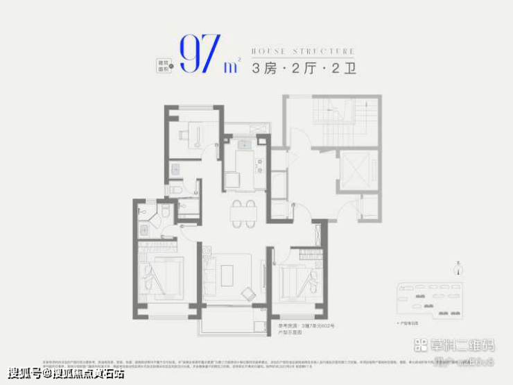97㎡三房两卫(三期):总价405万起,一梯两户(无连廊),南北通透,三开间朝南+观景阳台,主卧套房设计,满足改善型家庭品质生活需求。