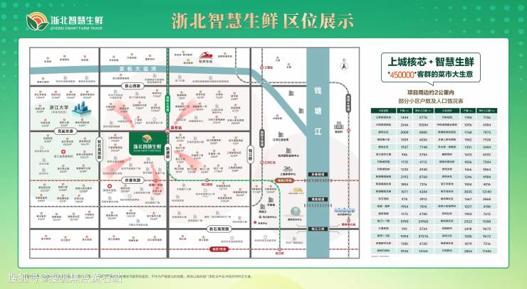 浙北智慧生鲜市场在凤起时代大厦负一楼,共计约5000平方,周边1.5 KM成熟小区共计106个,约60000户,长期固定人口约30万左右,如果按人均每天 15 元的吃喝支出,1年消费额近 16 亿,按肉类每户每日需求 1斤 果蔬每日需求2斤,每日共需 60000 斤肉, 120000 斤果蔬,市场需求相当庞大。