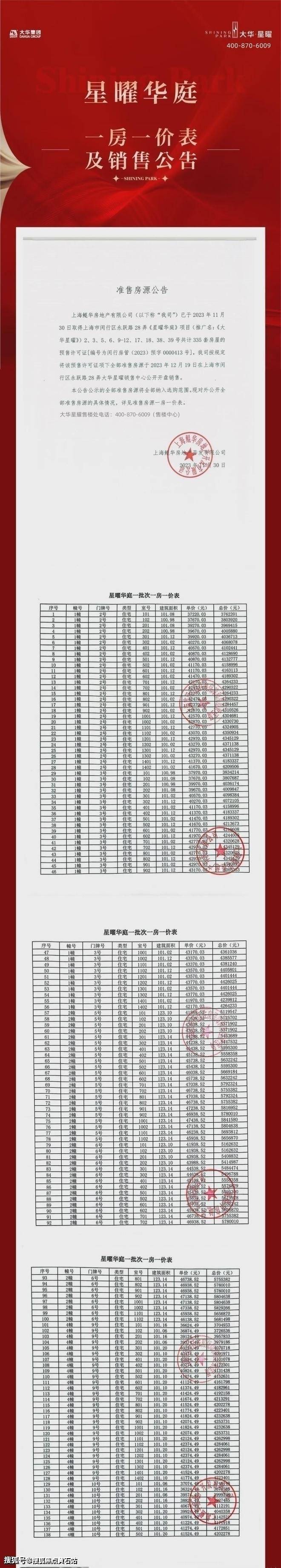 大华星曜项目一房一价表▼