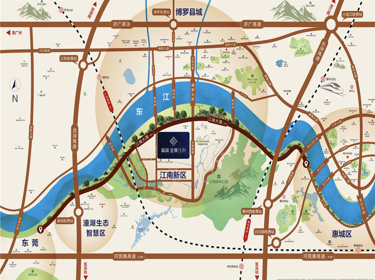 项目处于江南大道中段,江南大道开通后,项目距离惠城区约15km,距离潼湖生态智慧区约10km,距离东莞桥头约15km,交通便利,通达性强。