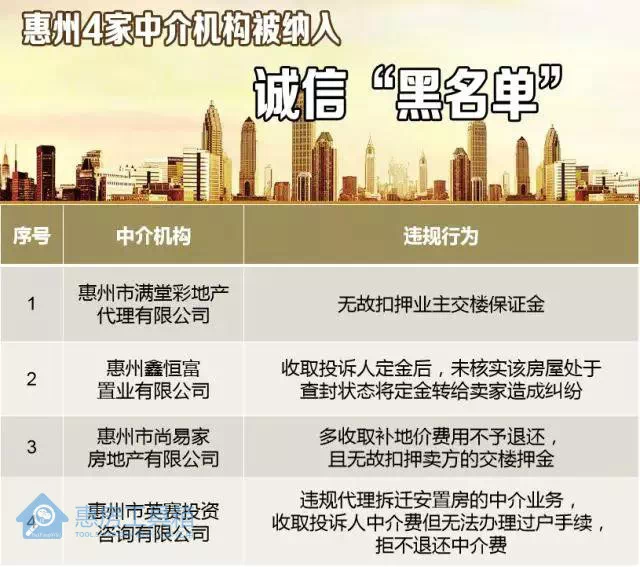 12月18日晚间,惠州市房产管理局发布了《关于对惠州市全洲房地产纪经有限公司等房地产中介企业违规行为的通报》,该局经过前期的信访案件处理和市场巡查,对于存在严重违规行为的惠州市全洲房地产纪经有限公司、惠州市满堂彩地产代理有限公司等5家违规中介机构予以惩处。其中满堂彩地产等4家机构均被纳入诚信“黑名单”,公司业务办理被同步叫停。