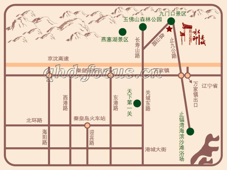 山海关区天下第一关北行12公里处,长寿山北麓,九门口景区南侧。