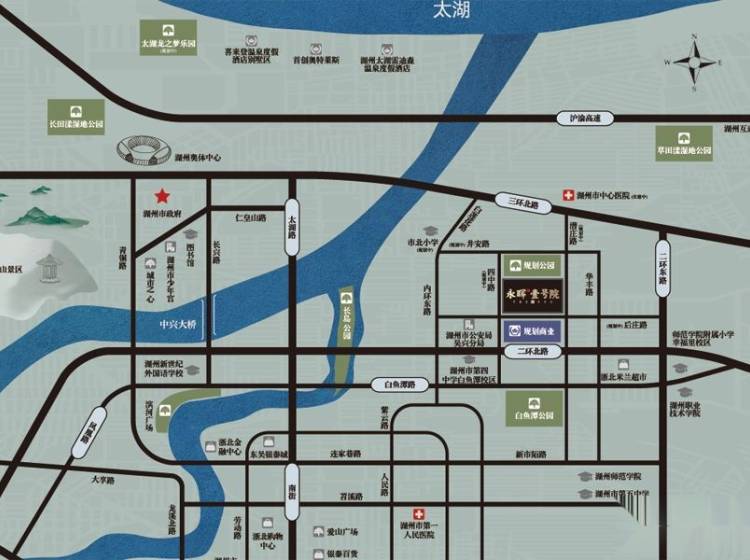 项目地处湖州,南临后庄路(规划中),东临潜庄路(规划中),西隔规划河流紧邻四中路。项目南侧规划商业性体育健身中心,北侧规划市政公园;项目由14幢5-8层电梯洋房和4幢26层高层住宅组成,建筑面积为89-135㎡,商业配套5万方,集超市、餐饮、休闲娱乐、办公于一体,以一城精粹资源,倾力构筑湖州品质生活新高地。