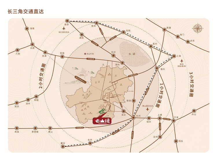 云山境,择址于被国家环保总局命名为排名前列“全国环境优美乡”的安吉山川乡,山川乡全乡森林覆盖率达88.8%,植被覆盖率91.3%,空气质量一级,地表水Ⅰ级,被誉为竹乡天然氧吧。云山境距离杭州城区50公里左右,经杭长高速从百丈高速出口下高速,经过霞大线转瞬即达山川。同时与杭长高速、申嘉湖高速共同构建沪杭都市圈,长三角旅游黄金圈。项目周边,拥揽众多知名景区,如中国大竹海、江南天池、天下银坑、藏龙百瀑等。还有总投资近30亿元的云上草原,云上草原是华东少有、南方较大的观光草原休闲度假景区。云山境作为云上草原规划的轻氧归隐生活区,,享受“春赏花”“夏避暑”“秋登山”“冬滑雪”四季旅游休闲度假体验。