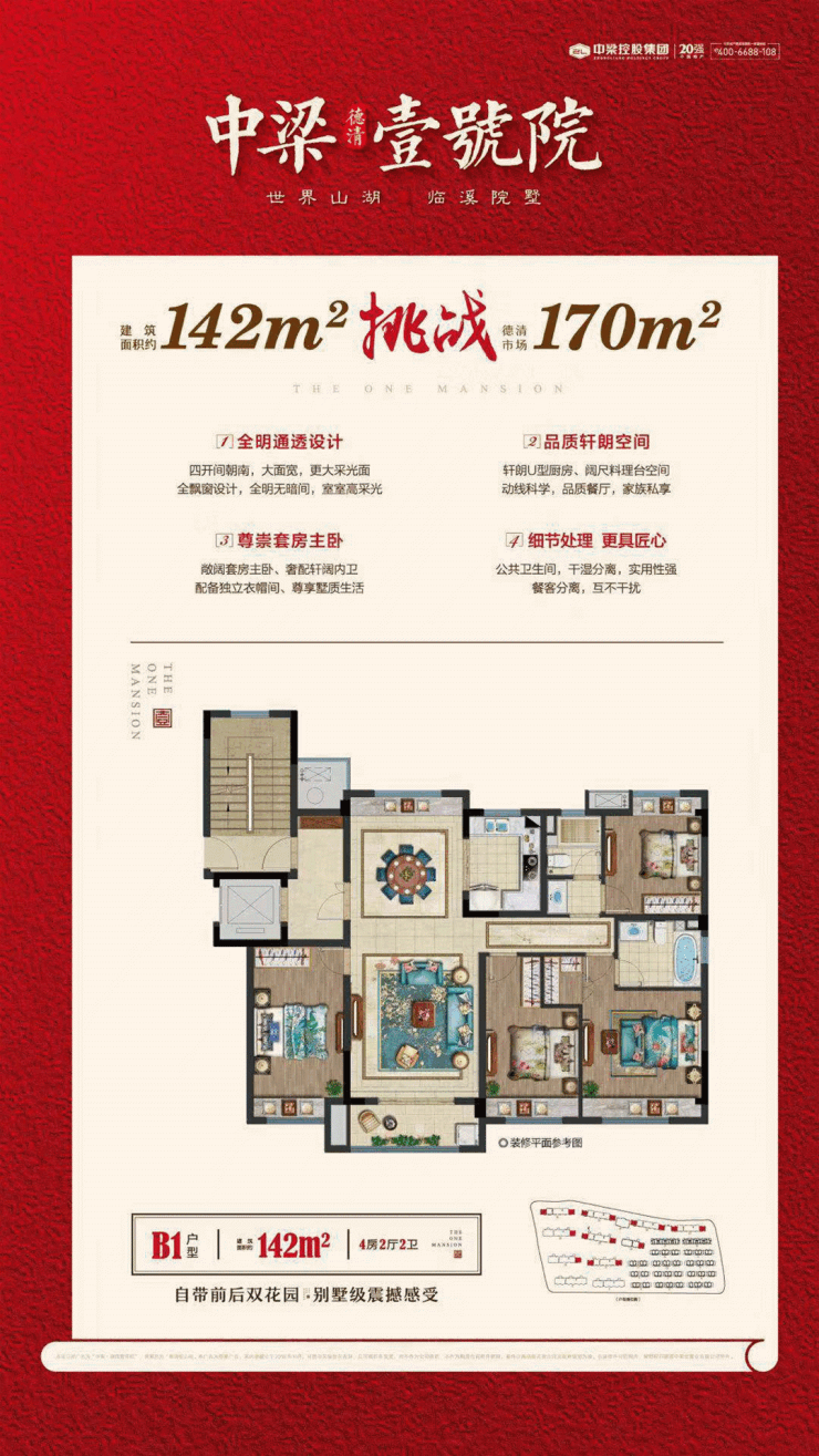 《中梁德清壹号院》“壹号“泛指一个勋号或者名号,代表着一种精神和标签,“院”院子,是根植中国传统的建筑文化,墅居人生,大隐于院,院子,自古以来就是达官贵人的终极追求,众所周知,别墅产品属于奢侈品,拥有不可复制的稀缺性,中梁德清壹号院则址德清城西较佳生态宜居板块,将院子与自然地貌、山、水互为一体,【莫干山、余英溪、壹号院】融汇城市精神和文脉传承,将中式传统文化铺排于莫干山下余英溪旁,度身定制中式豪宅,将德清人骨子里的门庭大院情节充分演绎。