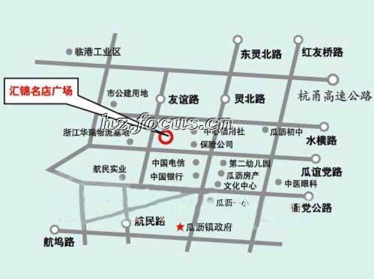 汇锦名店广场位于瓜沥镇中心,南邻瓜党路,西靠友谊直路,北接永横路,东边为规划道路,总占地面积65000平方米,拥有9万平方米的大型商业文化社区,可容纳72000人的超大购物广场,由多层联排精品商店、精品公寓、风情商街、主题公园、中心广场组成,建成后的汇锦名店广场将成为萧山东片 的规模商业文化旗舰区,辐射整个萧山东部。