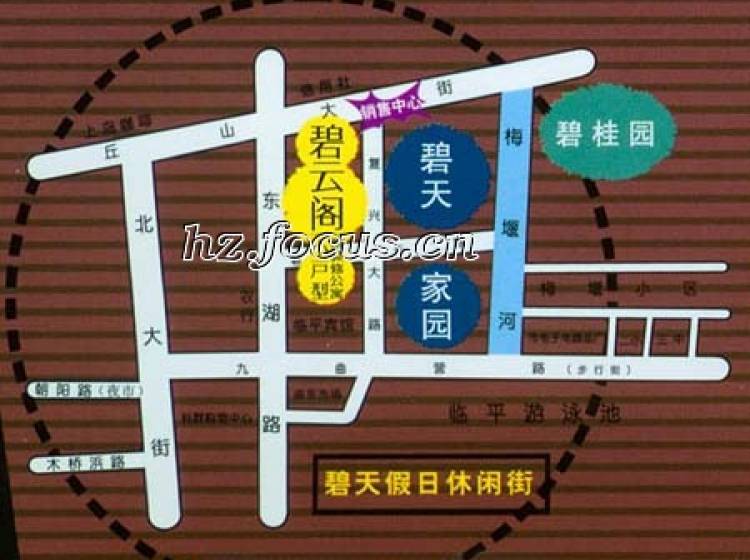 临平是余杭区、区政府所在地,是余杭区政治、文化、商贸中心,社会经济发展持续稳定,尤其是撤市设区后,人均GDP和人均收入消费水平达到了杭州市人均水平,市场活跃,经济繁荣。在杭州房地产快速升温的带动下,临平房地产发展势头迅猛,房价水平比杭州市有较大优势,加上交通条件的日益改善,杭州市内和外来投资者都十分看好临平的居住环境和商业环境,临平吸引了一大批的安家置业者,这更为临平未来的发展奠定了人气基础。由理想四维地产集团有限公司开发的碧天假日休闲街地处临平老城区繁华地带。东连梅堰小区,南齐九曲营路、西通东湖路,北接丘山大街,处于临平最大住宅小区——梅堰小区通往城区中心之间的黄金地块。其主干道碧天路一线沟通梅堰小区与东湖路,是梅堰小区居民日常必经之路。项目由碧云阁及碧天家园营业房组成,整个商业街呈田字型,总长达738米,其中,碧天路宽18米,长273米,复兴路宽14米,长270米,共有商铺132套,其中碧天家园商铺90套,商铺面积达11000平方米,碧云阁商铺32套,商铺面积为9000方。以两层商铺为主,部分有一层或三层结构,三层以上为小区住宅。商铺面积大多在100—400平米不等