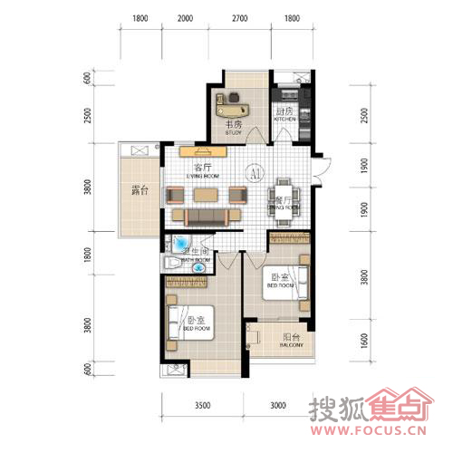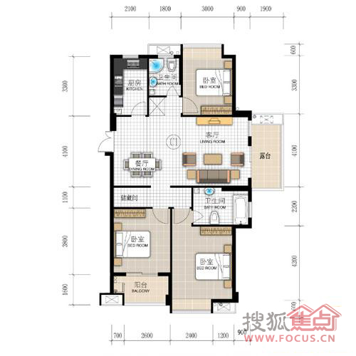 3室2厅1卫-联合.格里 约90方-3 3室2厅1卫1厨90㎡