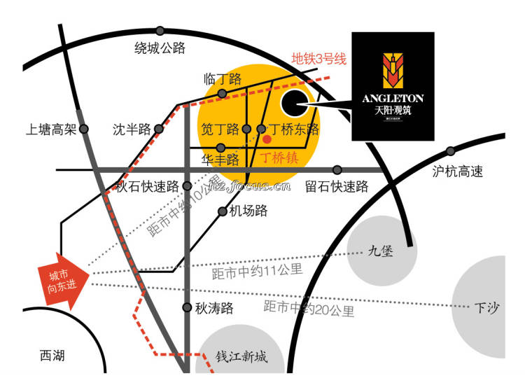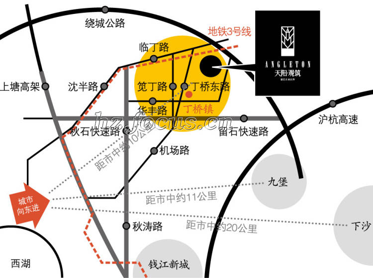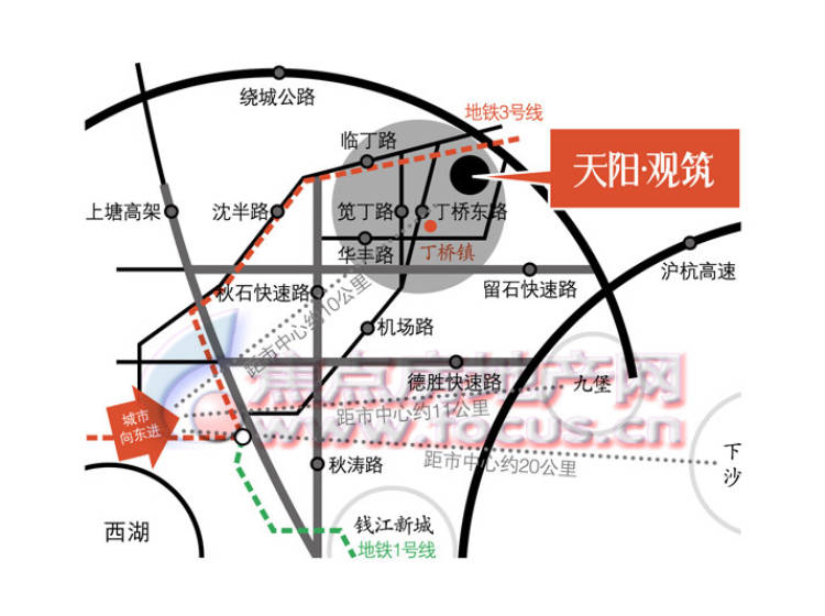 位于丁桥的天阳观筑,距离武林广场仅10多公里,南与上东城毗邻,北临绕城高速,西临规划中的六号路,东接规划中的小学。地铁3号、秋石高架路、留石高架路建成后,将迅速连接市中心。作为杭州未来的CLD(CENTER LIVING DIRECTION中央生活区的简称),丁桥将成为杭州新居住区,三五年后,将融入中心城区,以10万人居住的大规模构建凝聚环境要素、人文要素、心理要素的成熟区块。而正处丁桥核心的天阳观筑,将以优越的姿态,享受到板块崛起的无限可能。为城市主流人群构筑高品质的居住空间,一直是天阳置业为之不断努力的企业目标,2008年,位于丁桥的天阳•观筑在天阳置业全力打造之下,必将为该区块注入新鲜血液,成为区域标志性楼盘。同时,它也将成为天阳置业不断超越,不断为城市打造人居经典的明证。