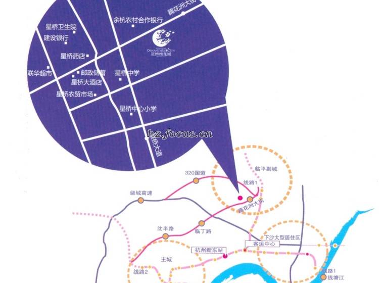 星桥有山有水,环境优美,位置优越,位于杭州与临平交接处,交通十分便利,临丁路和320国道两条主干道与杭州市区相连,地铁3号线也横穿星桥。杭州北扩与临平的南移将使该区块成为未来几年的热点。星桥生活配套完善,学校、银行、菜场、公园、公交站点等均在500米范围之内。