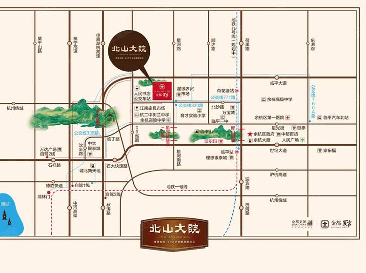 交通:畅达交通构筑半小时都市圈,星河路隧道将于2015年底通车,长途客运站、沪杭高铁临平站、地铁1号线临平始发站近在咫尺。经秋石快速路,半山隧道均可直达杭州市中心,车程仅为半小时左右。K330、338公交车直达杭州市区。轨道交通:地铁1号线临平始发站换乘760A和771公交车直达项目。