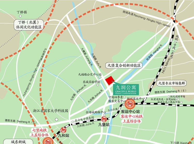 九堡作为居住区及杭城东北部40万人居住的中心,随着政府开发进度的加速,商业与住宅发展合力并进,将形成以杭州客运中心、中国四季青服装交易中心为核心的九堡新商圈。郡原地产、华浙实业将致力于在都市新商圈为城市白领及成熟家庭提供优质的居住场所,创造出与众不同的建筑气场,将九润公寓打造成杭州主城区住宅产品高品质化的标志性项目。