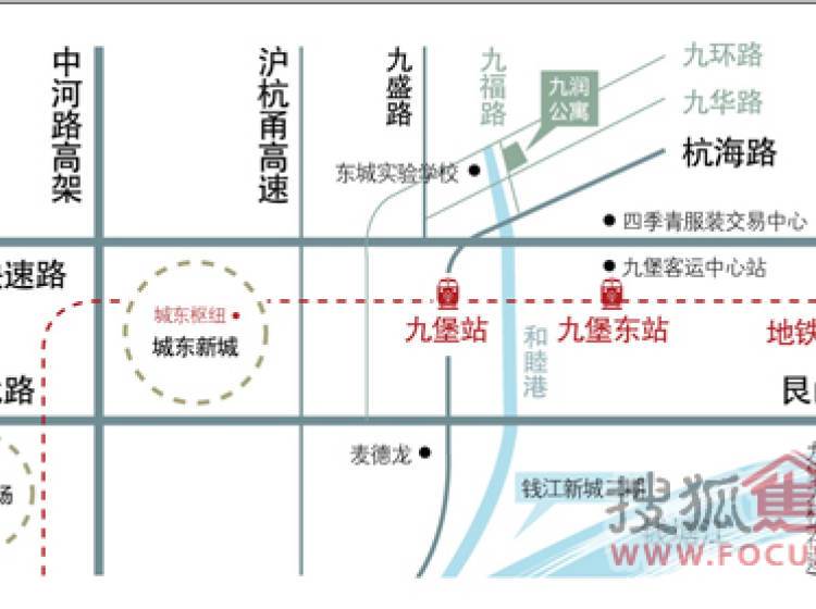 商场:新客站商业城、四季青服装交易中心、世纪联华、五星电器、红星美凯 凯龙等休闲:和睦港公园邮局:九堡邮政所银行:工行、农行、建行、中行、交行、招行、中信、浙商、杭州银行、杭州联合银行幼儿园:九堡中心幼儿园、九昌路幼儿园学校:杭州师范大学东城教育集团东城实验学校医院:九堡医院