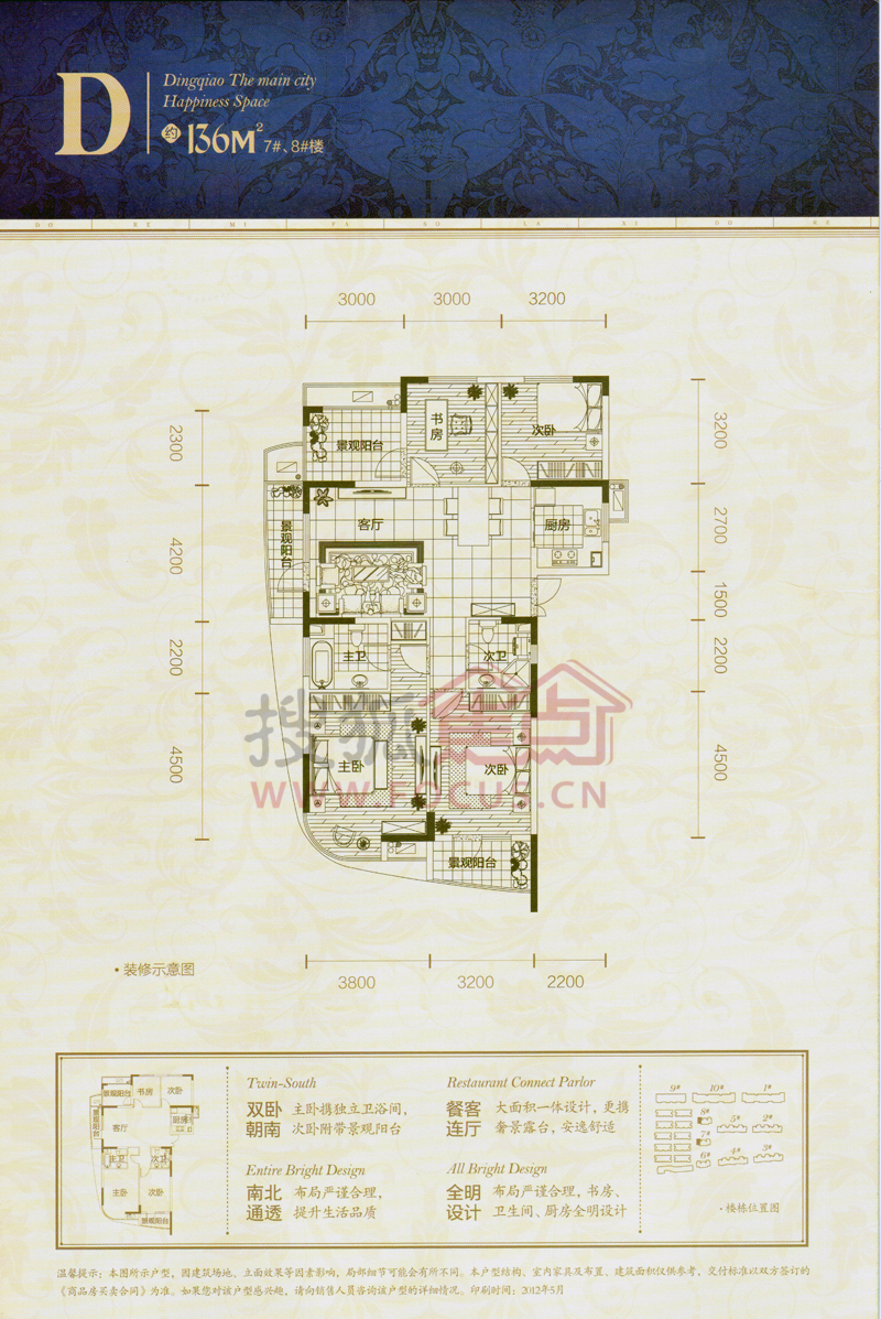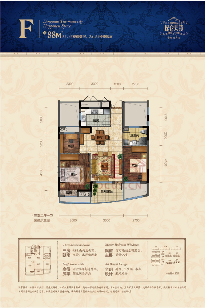 3室2厅1卫-约88方3、4#楼偶数层2、5#楼奇数层中间套F户型