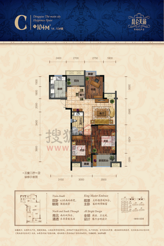 3室2厅1卫-约104方1、10#楼中间套C户型