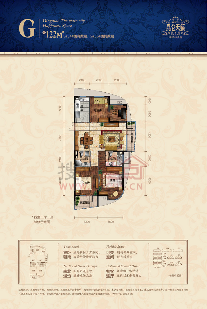 4室2厅2卫-约122方3、4#楼奇数层2、5#楼偶数层边套G户型