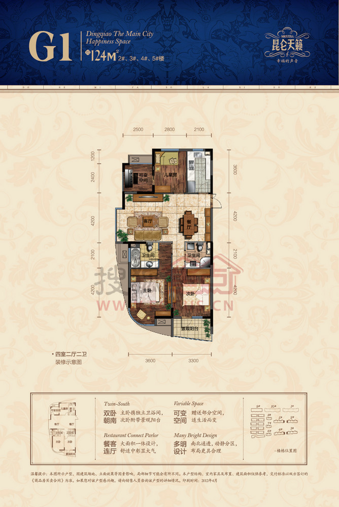 4室2厅2卫-约124方2、3、4、5#楼边套G1户型
