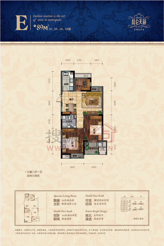 3室2厅1卫-约89方2、3、4、5#楼中间套E户型