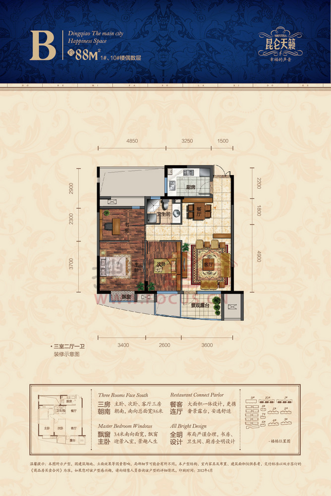 3室2厅1卫-约88方1、10#楼偶数层中间套B户型