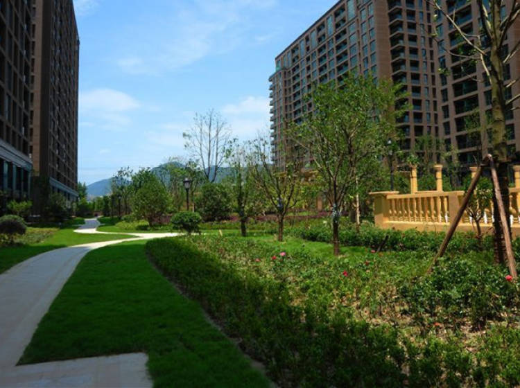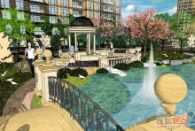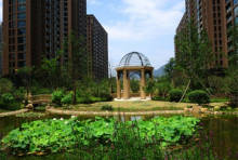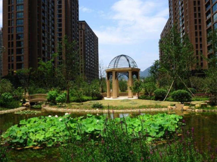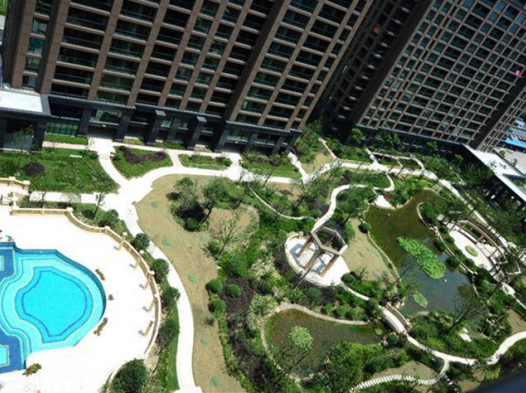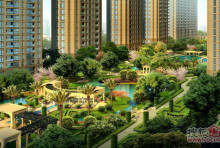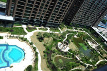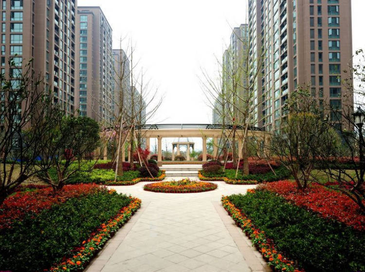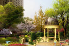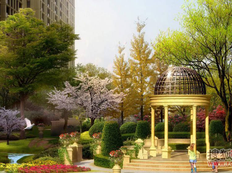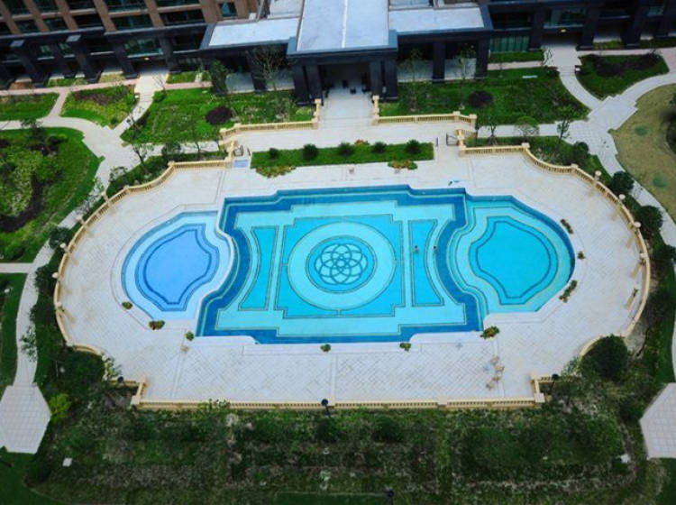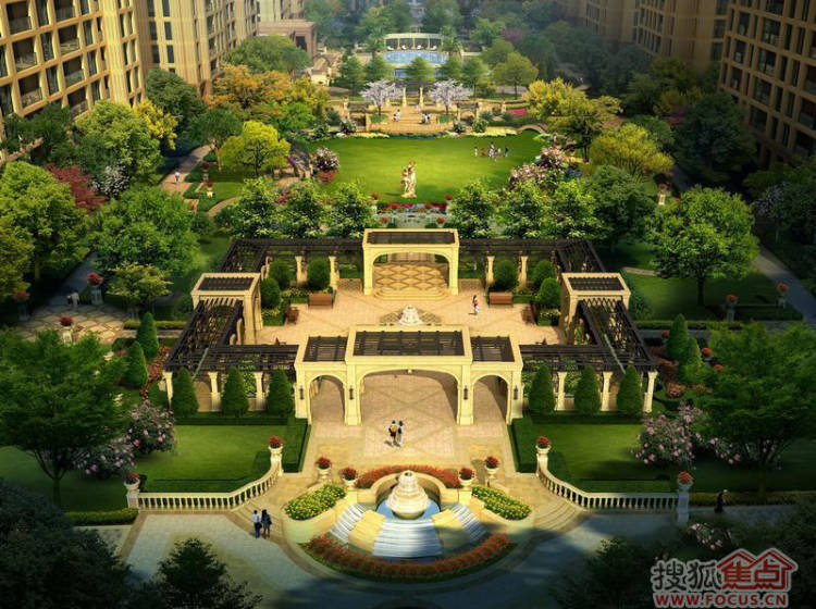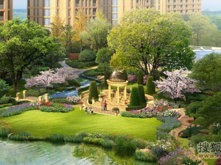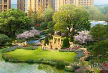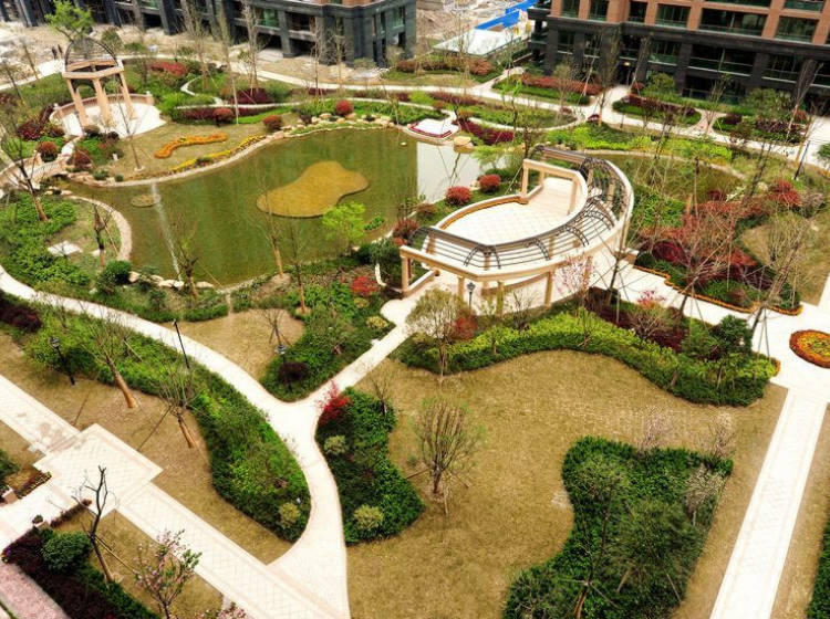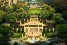 景观设计由园林景观设计单位安道国际主笔,以规则式布局体系由西向东依次排列而来,形成半开放的千亩轴对称式长方形内部景观区域。以“一轴、四点、十庭院”的理念,与十大入口庭院形成外分散,内聚合的造园格局。融合英式自然形态与法式规则园林的独特精髓,统领“水文生态、中心泳池、垂直绿野、绿野仙踪”四大内部景园,缔造“尊荣皇室后花园”生活。