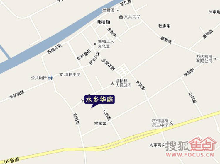 杭州新城北塘栖镇中心区域,东至稽水湾港,南贴人民路,西邻350路公交车站(焦家村公交中心站至塘栖),北临圣堂漾河