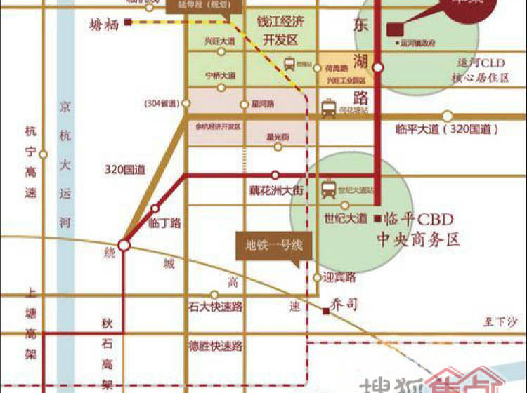 金世纪运河丽园与运河镇政府行政中心隔路相望,毗邻规划中的运河核心景观湾区-亭趾港核心景观湖;西向车行5分钟即达规划面积25.3平方公里的经济开发区——钱江经济开发区;南侧毗邻规划面积1.47平方公里的兴旺工业城;东侧、北侧为规划中运河CLD的商业、金融、酒店等主要配套区域。一期的景观设计以南北中心水景轴线为主体,串联三大中心景观绿化区,三组宅间庭院活动区和四片密林景观区。