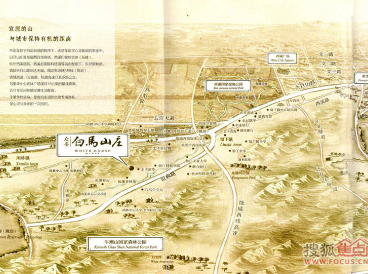 众安白马山庄总建筑面积约24万方,择址于杭州大城西小和山区域,区域内拥有闲林水库(在建)、午潮山国家森林公园,以及人文气息浓郁的小和山高教园区,浙江工业大学、浙江科技学院、浙江外国语学院、杭州外国语学校等高等院校皆布局于此。作为众安潜心15年的首部山居类作品,白马山庄不仅是众安房产一次新的尝试,在产品打造及运营上更将是一次升华!它所倡导的有机山居,将会成为当下人们选择高品质住宅的一个新的方向。