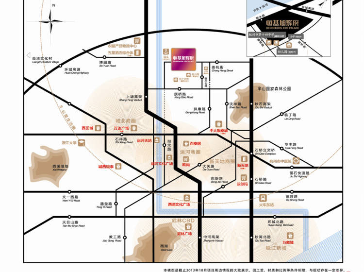 恒基旭辉府位于杭州市余杭区崇贤街道,南侧紧邻崇杭街,东侧为康兴路,西靠里洋路,北依石塘路,该地块西侧不远处为京杭大运河,地理位置相对良好。该地块总用地面积约86670平方米,地上建筑面积约216675平方米,容积率2.5,整个用地相对比较方整。项目建设内容包括沿街商铺、高层住宅及花园洋房。