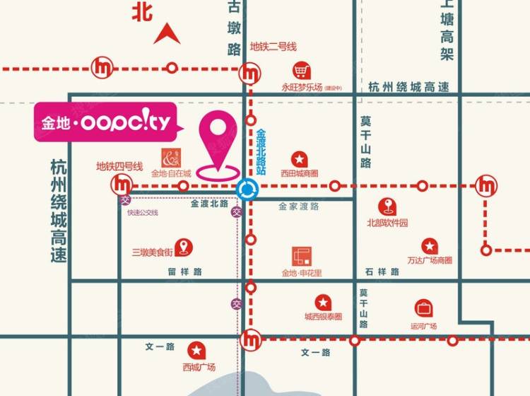 杭州金地广场位于杭州三墩板块,西湖区、余杭区的交界处,紧邻主干道古墩路,商场负一层为地铁2、4号线换乘点,与地铁无缝接轨;10分钟到达城市中心,既能享宁静,也能拥繁华。