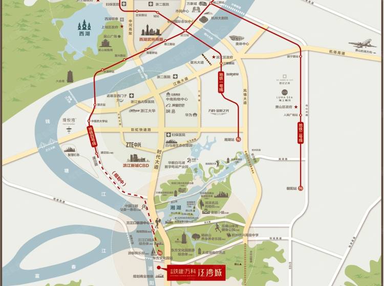 铁建万科江湾城位于滨江南时代大道上,东方文化园向南1.5公里,交通快捷,规划 4号线(延伸段), 打造湘湖新城千亿级配套,包括有八大商业综合体、前沿的产业园区、大型医疗配套等。项目总体量约27万方,规划14幢高层和社区商业,小区打造七彩大城生活系统,包含:服务、健康、交通、景观、商业、 、社交七个方面,主张把社区内好的资源向业主开放、共享,设立全龄运动场地、健身BOX等社区空间,更可享新街坊、万科学习 、健身BOX等丰盛配套。