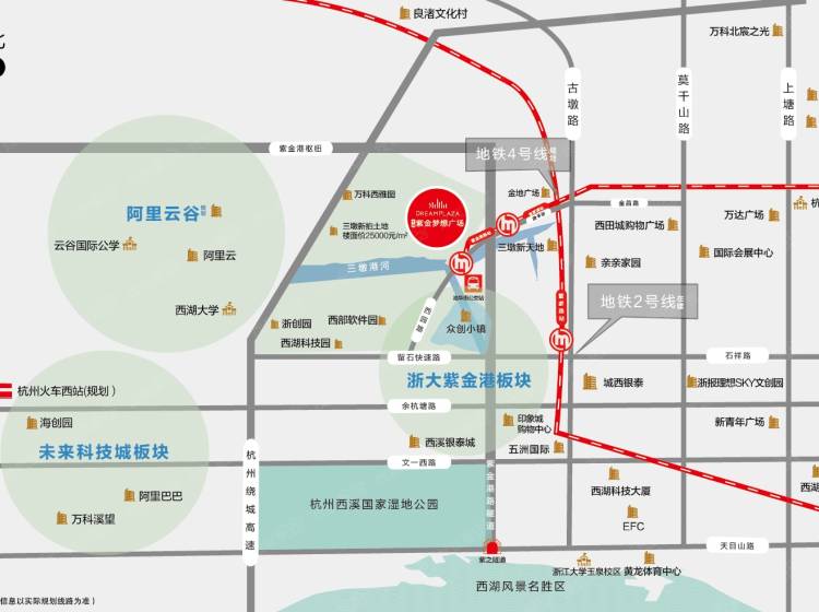 紫金梦想广场,地处杭州市西湖区三墩镇池华街与榨河巷交叉处。领衔城西科创大走廊龙头位置,依托浙大紫金众创小镇、阿里云谷等科技产业带,云创独角兽总部集群。上游产业链,精英云集的智慧高地,板块价值突显。