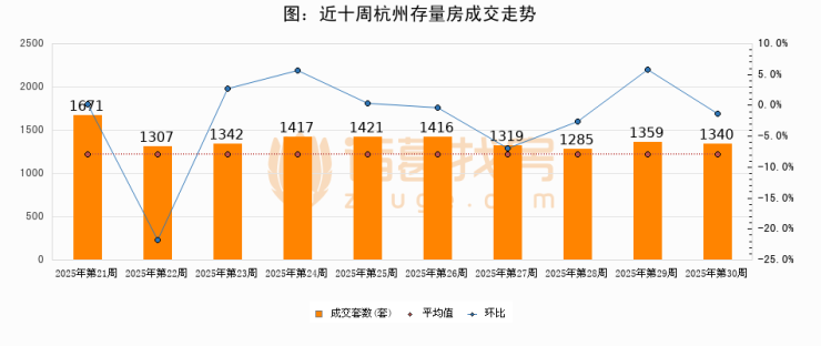 存量房方面,第30周杭州存量房成交1340套,较上周减少19套,环比下降1.4%。从近十周成交走势来看,周均成交套数为1387套,本周低于平均水平3.4%。