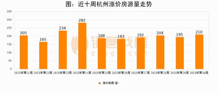从调价房源来看,第30周杭州涨价房源210套,较上周上涨7.7%。与此同时,30周涨价房源占比回落0.5个百分点,业主信心小幅波动,购房者可则需入市。