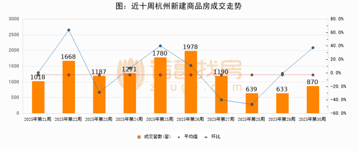 进入2025年第30周(07月21日-07月27日),杭州新建商品房成交870套,较上周增加237套,环比上涨37.4%。从近十周成交来看,周均成交套数为1223套,本周成交870套,低于近十周平均成交量28.9%。