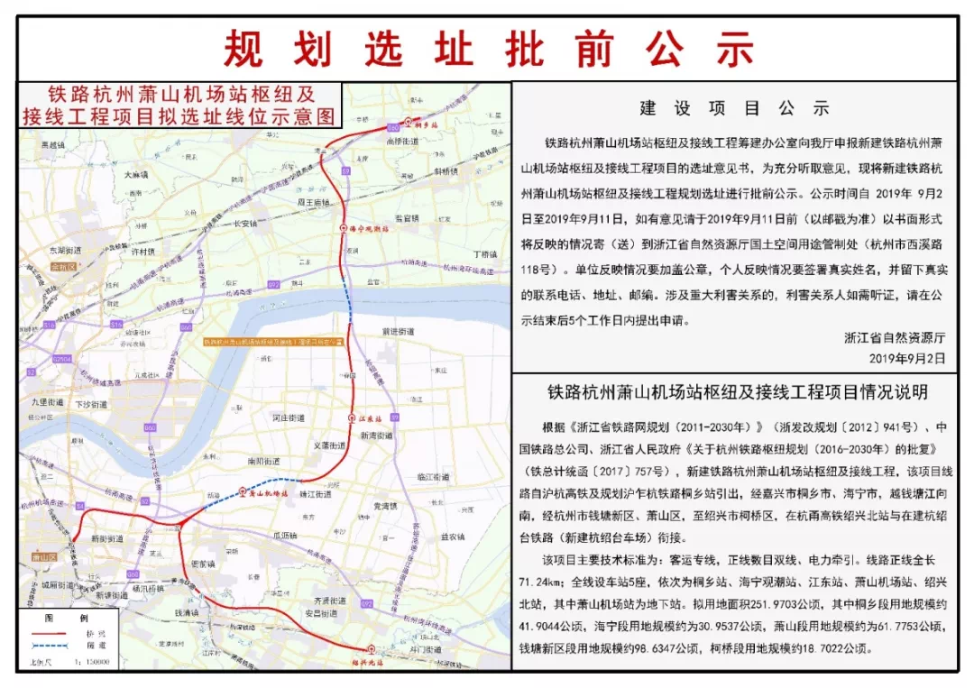 根据公示的规划选址批前方案,新建的铁路杭州萧山机场站枢纽及接线工程,线路自沪杭高铁及规划沪乍杭铁路桐乡站引出,经嘉兴市下辖的桐乡市、海宁市,跨越钱塘江向南,经杭州市内的钱塘新区、萧山区,至绍兴市柯桥区,在杭甬高铁绍兴北站与在建杭绍台铁路衔接。