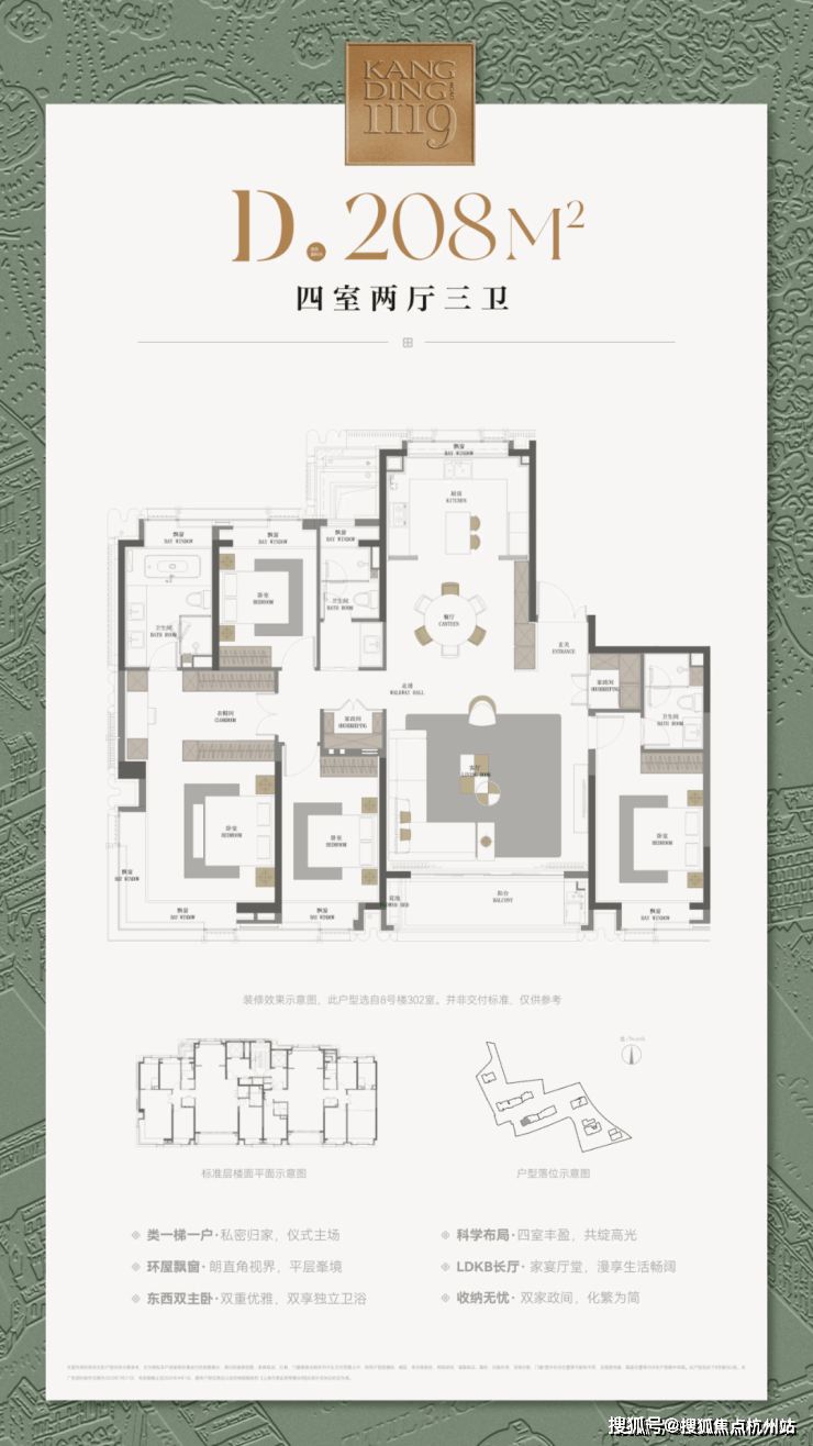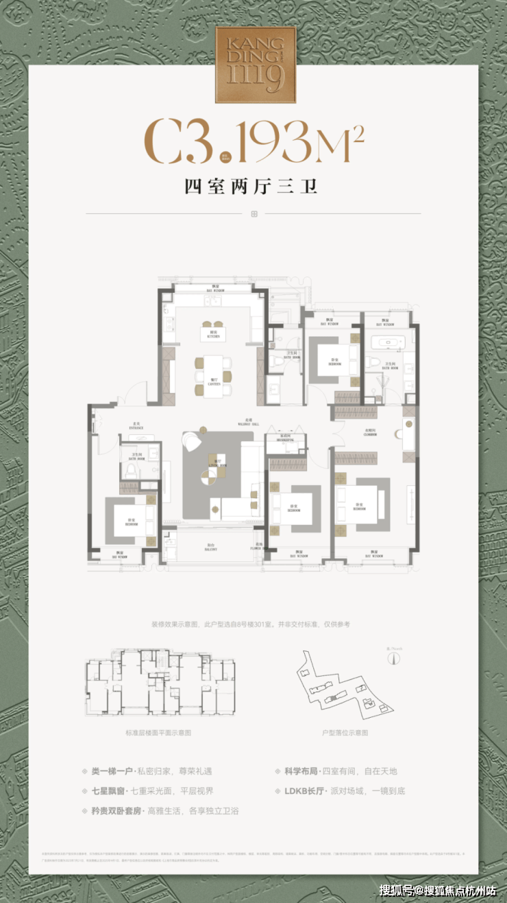 以建面约193户型为例,卫浴设备采用国际品牌如 唯宝、高仪、卡德维 等,厨电品牌采用 嘉格纳 ,全套配置油烟机、灶台、洗碗机、双开门冰箱、蒸烤一体机等,同时装配 德国美诺 洗衣机烘干机套装。