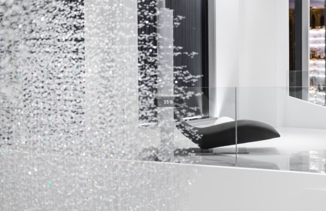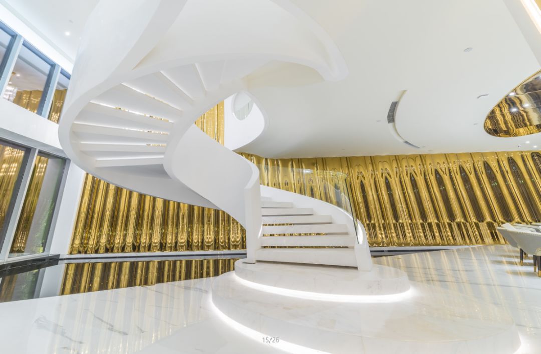 饶富变化的空间以金、白为主色调,透过几何的线、面呈现3D立体之感,带给杭州一场前所未见的超现实空间。