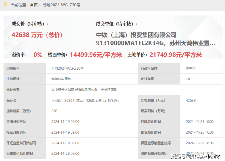 中铁咏月台,即,苏地2024-WG-Z30号地块项目,位于吴中经开区城南街道枫津路东侧、天灵路南侧,是2024年11月28日,中铁&天鸿伟业以底价42638万元竞得,成交楼面价14500元/平。