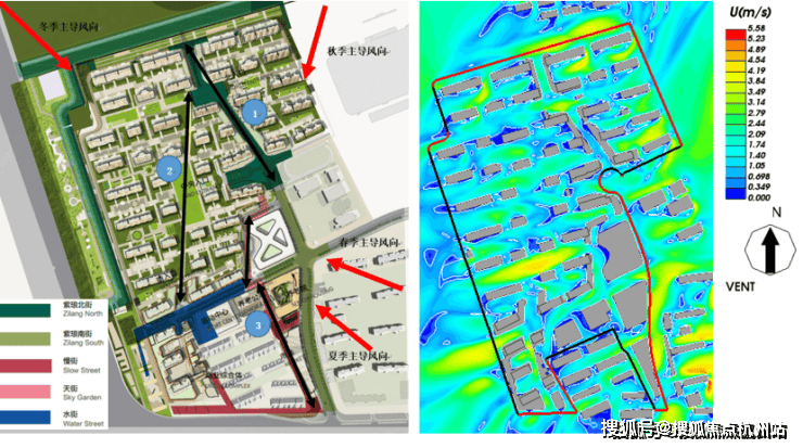 通风廊道:室外热环境,天安1号二期售楼处电话:400-998-9694 社区建筑布局可形成南北两条通风廊道。通风廊道2,与秋季主导风向基本平行;通风廊道1、3与夏季主导风向夹角约22.5°,与春季主导风向夹角约45°;通风廊道1与冬季主导风向夹角约22.5°左右。社区布局有利于冬季防风,过渡季自然通风。