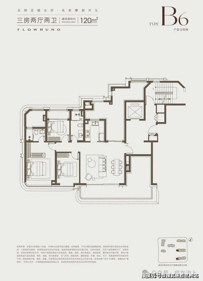 建面约120㎡3房2卫户型