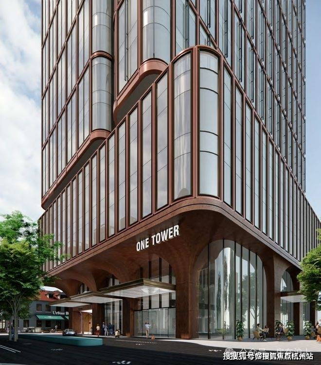 分建筑以暖色为基调,香槟金为点缀,采用大面积玻璃幕墙+铝板弧形立面;