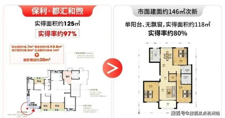 洋房标准层边套赠送面积约30㎡,实得率高达97%,相当于直接赠送约200多万价值,常规项目80%的实得率与之相比差距明显,该户型实际可享受常规155-160㎡的空间尺度。