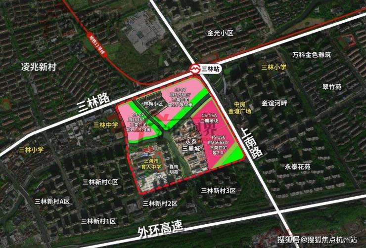 该地块为三林镇金光村“城中村”改造的重点项目,紧邻地铁11号线三林站,规划一条12米宽公共步行通道,连接社区与地铁站;同时周边有中房金谊广场、三林中学、东方医院等生活配套。