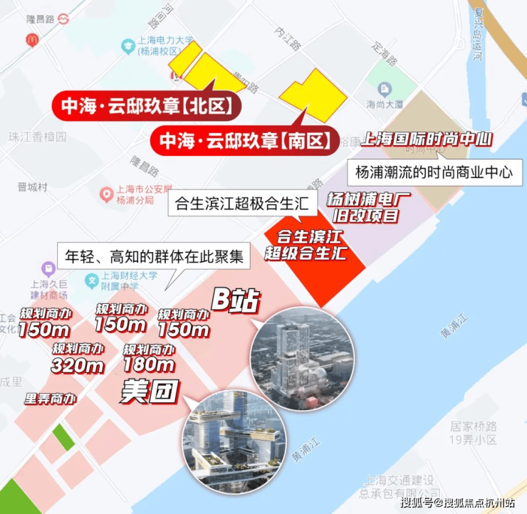 中海·云邸玖章距离江岸直线距离仅约500m,作为当下片区内离江最近的项目,享美团、B站、超级合生汇等地标综合体配套,杨浦滨江生活中心。